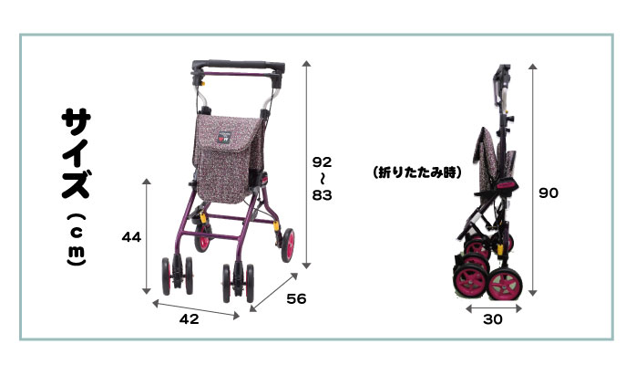 | 幅42×奥行56×高さ83〜92cm(4段階) (折りたたみ時:幅42×奥行30×高さ90cm) |